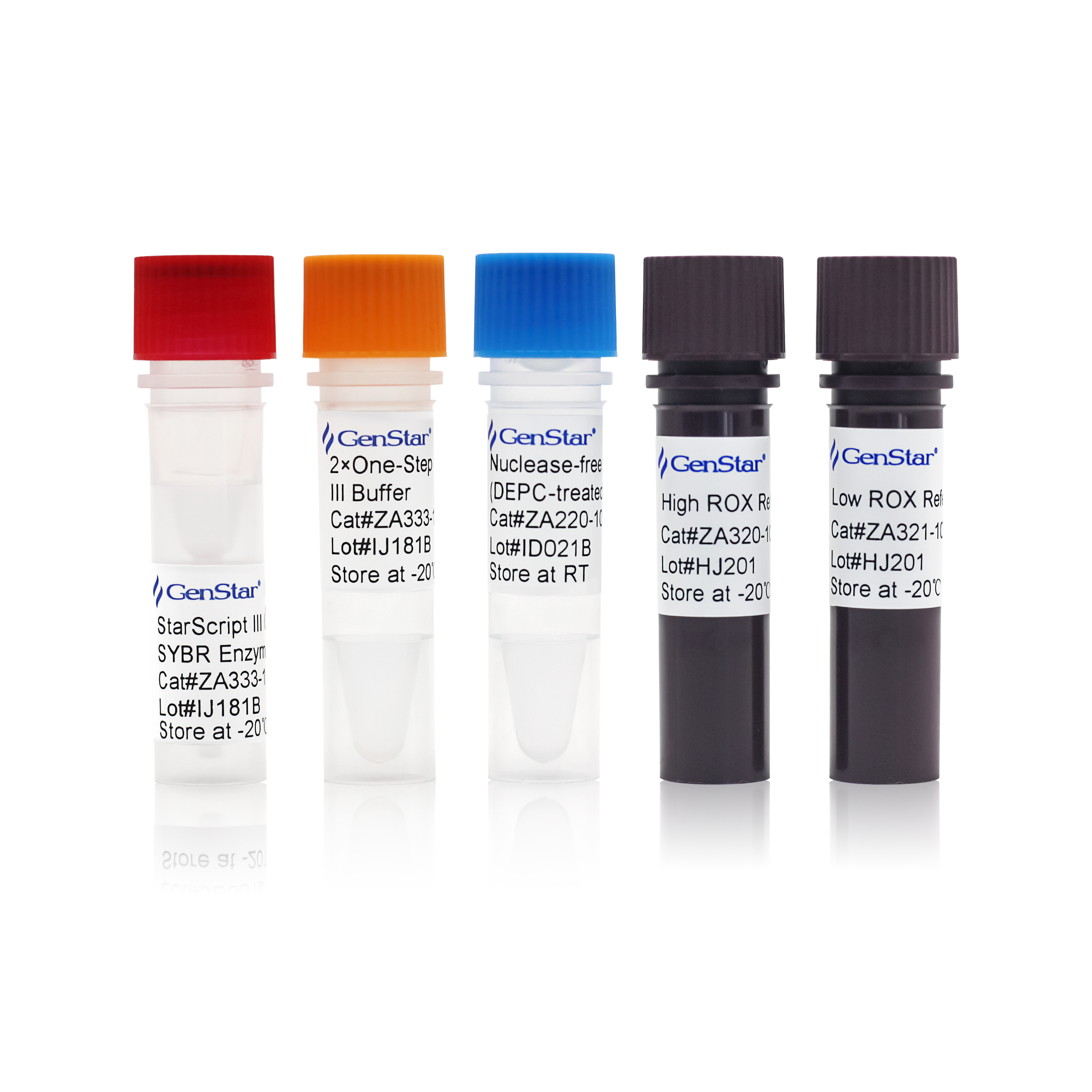 StarScript III One-Step qRT-PCR SYBR Kit 是采用 SYBR Green I 嵌合熒光法進行一步法實時熒光定量檢測的專用試劑盒。使用本制品進行 Real Time RT-PCR 反應(yīng)時以提取的 RNA 為模版,在同一反應(yīng)管內(nèi)連續(xù)進行反轉(zhuǎn)錄和熒光定量檢測,操作簡單,并能有效防止污染?;?StarScript III 反轉(zhuǎn)錄酶、抗體型 HotStart Taq DNA 聚合酶、配合優(yōu)化的 Buffer 體系,對于二級結(jié)構(gòu)復雜和 GC 含量高的 RNA 模板擴增效果好,非常適合于 RNA 病毒等微量目標基因的檢測。