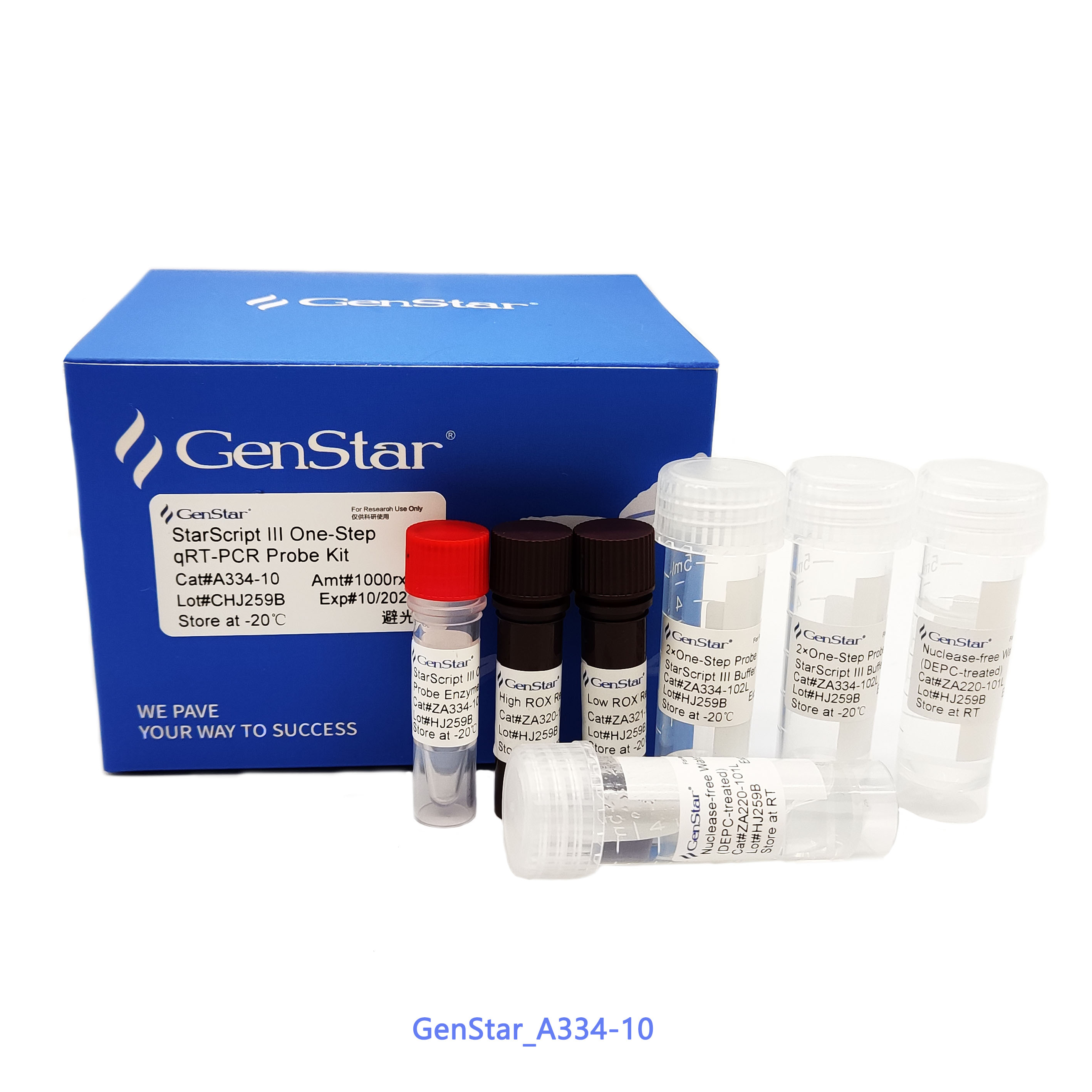 StarScript III One-Step qRT-PCR Probe Kit 是采用探針法進(jìn)行一步法反轉(zhuǎn)錄實(shí)時(shí)熒光定量檢測(cè)的專用試劑盒。使用本制品進(jìn)行 Real Time RT-PCR 反應(yīng)時(shí),以提取的 RNA 為模板,在同一反應(yīng)管內(nèi)連續(xù)進(jìn)行反轉(zhuǎn)錄和熒光定量檢測(cè),操作簡單,并能有效防止污染、降低加樣誤差。基于 StarScript III 反轉(zhuǎn)錄酶、抗體型 HotStart Taq DNA 聚合酶、配合優(yōu)化的 Buffer 體系,對(duì)于二級(jí)結(jié)構(gòu)復(fù)雜和 GC 含量高的 RNA 模板擴(kuò)增效果好,非常適合于 RNA 病毒等微量目標(biāo)基因的檢測(cè)。