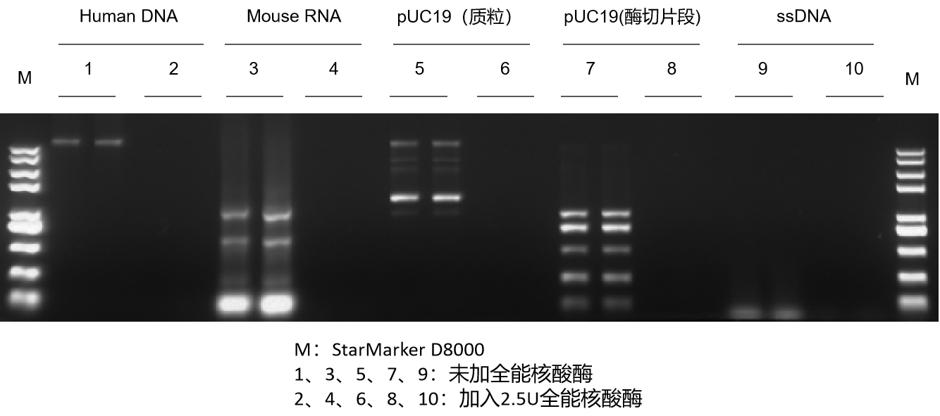 在 20 μl 體系中,使用 2.5 U GenStar #A511對 1 μg不同類型的 DNA 和 RNA 37℃ 孵育 40 min。結(jié)果顯示,A511 可高效降解不同類型 DNA 和 RNA。