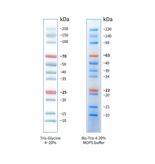 本產(chǎn)品由跨度從 10-250 kDa 的 11 種高度純化的橙色、藍色預(yù)染蛋白質(zhì)組成。其中 25 kDa 條帶和 70 kDa 條帶為橙紅色預(yù)染條帶。本產(chǎn)品適合作為 SDS-PAGE 電泳時,變性蛋白樣品的分子量參照,并可實時觀察蛋白樣品的電泳分離狀況,也可用于檢測 Western blot 的轉(zhuǎn)膜效率。由于共價結(jié)合的染料會影響蛋白質(zhì)分子的電泳遷移率,本產(chǎn)品僅適于粗略地估計目的蛋白樣品的分子量。