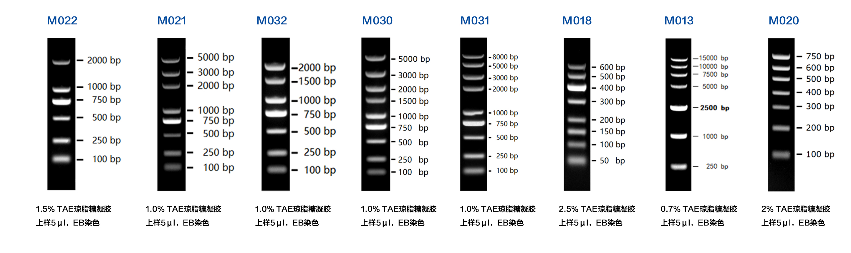 本產(chǎn)品為預(yù)混了上樣緩沖液的即用型 DNA 分子量標(biāo)準(zhǔn),由 6 條線狀雙鏈 DNA 條帶組成,適用于對 100-2000 bp 的雙鏈 DNA 分子大小的估算和粗略定量。本產(chǎn)品的 6 條帶分別為 100、250、500、750、1000 和 2000 bp。其中 750 bp 條帶濃度最大,為 100 ng/5 µl,其余條帶濃度約為 50 ng/5 µl。