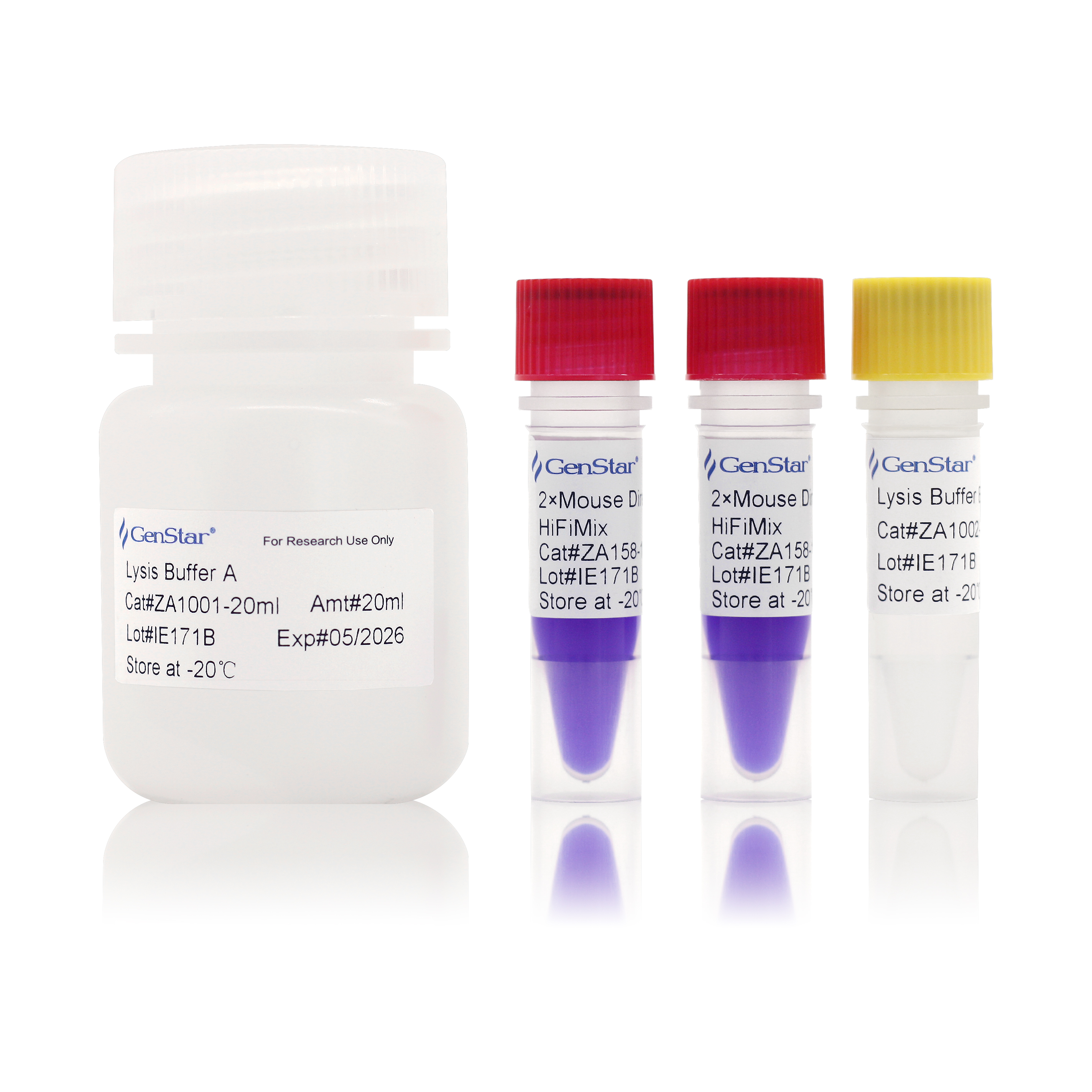 本產(chǎn)品包含小鼠組織粗提和后續(xù) PCR 擴(kuò)增的整套試劑,適用于小鼠基因型快速鑒定。采用獨(dú)特的裂解液可從小鼠尾巴、耳朵以及腳趾等組織中快速釋放基因組 DNA,無(wú)需純化,可直接用于后續(xù)的 PCR 擴(kuò)增和鑒定,極大縮短了實(shí)驗(yàn)耗時(shí)。
