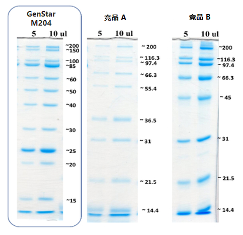 本產(chǎn)品包含了 12 種未染色重組蛋白的混合物,預(yù)先用上樣緩沖液稀釋,用于 SDS-PAGE 電泳。通過 SDS-PAGE 電泳并經(jīng)考馬斯亮藍(lán)染色后,在 10-200 kDa 范圍內(nèi)會(huì)形成 12 條明亮清晰的條帶。12 種條帶分別為:10、15、20、25、30、40、50、60、85、100、150、200 kDa,其中增強(qiáng)的蛋白條帶為 25 kDa 和 85 kDa。本產(chǎn)品為非預(yù)染型蛋白分子量標(biāo)準(zhǔn),可準(zhǔn)確的反映目的蛋白樣品的分子量。