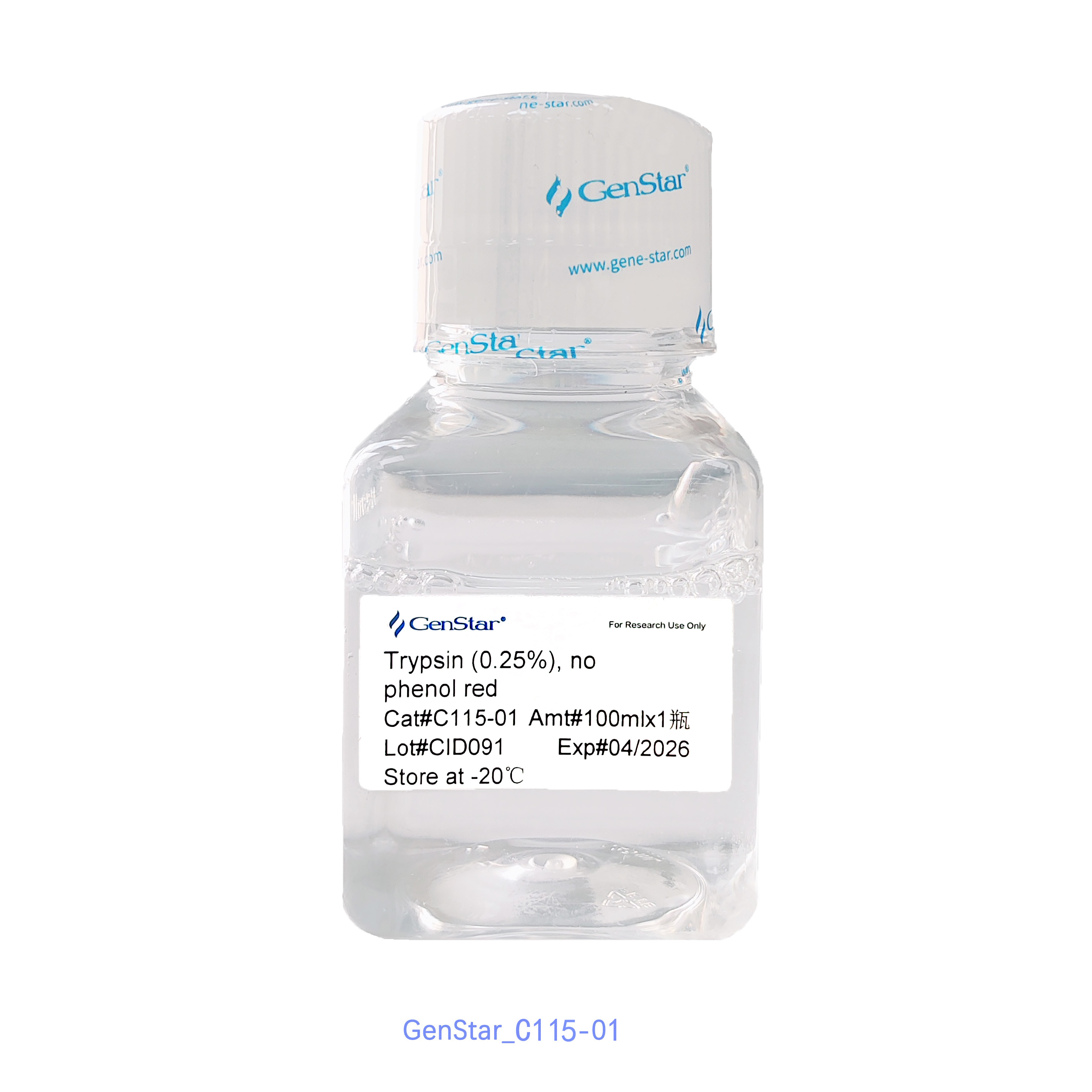 胰蛋白酶(Trypsin)是一種普遍發(fā)現(xiàn)于脊椎動物消化系統(tǒng)的絲氨酸蛋白酶,能水解蛋白,以無活性的胰蛋白酶原(trypsinogen)的形式分泌于胰腺中。其切割肽鏈的位點(diǎn)主要位于賴氨酸或精氨酸的羧基端(二者緊接脯氨酸的情況除外)。 本產(chǎn)品含 0.25% 胰蛋白酶,不含 EDTA 和酚紅,不含 Ca2+和 Mg2+。已用 0.22 μm 濾膜過濾除菌,可以直接用于培養(yǎng)細(xì)胞、組織的消化,通常室溫消化 1 min 左右就可以消化下大多數(shù)貼壁細(xì)胞。
