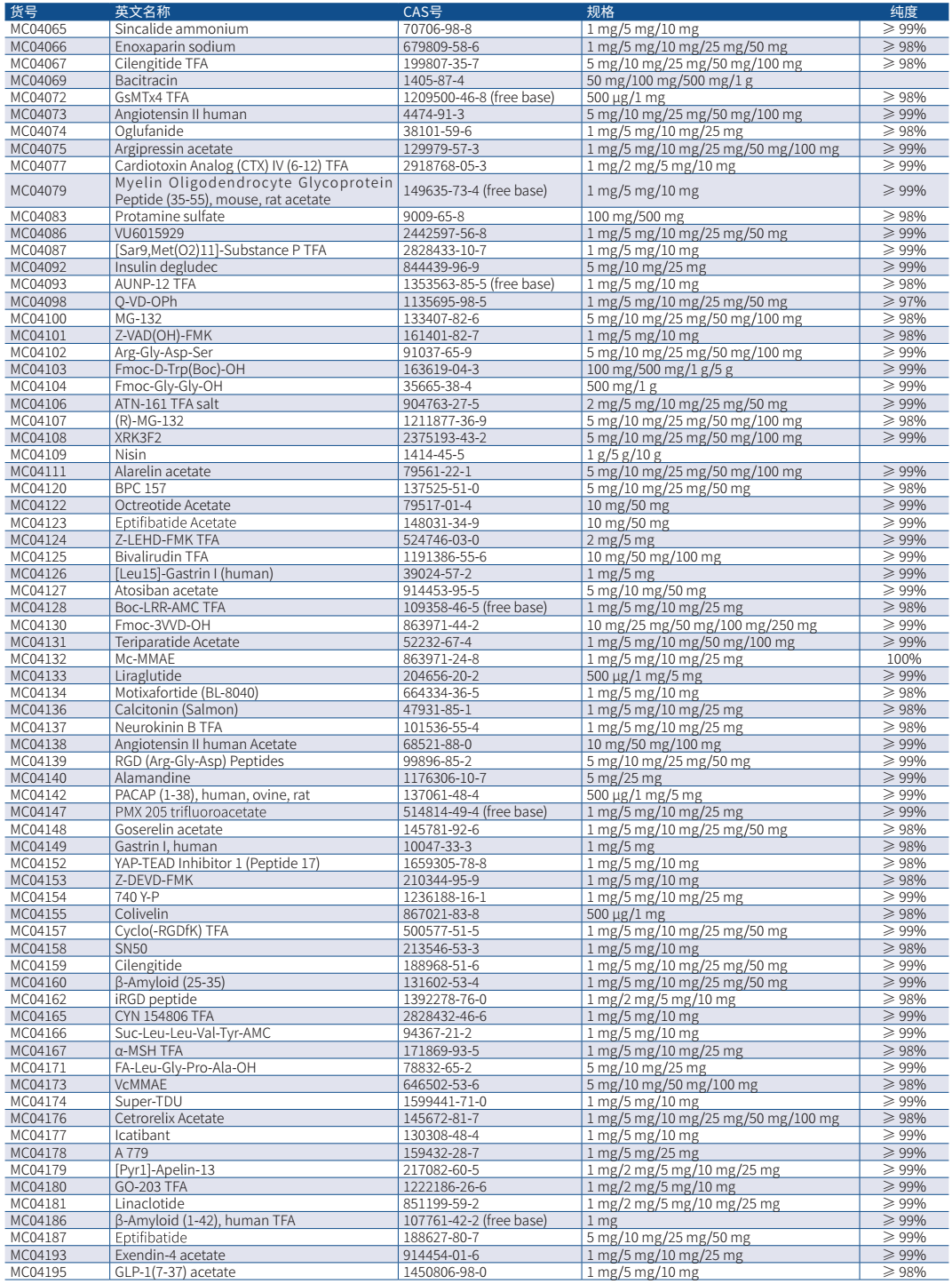 多肽是以氨基酸為基本單位,經(jīng)肽鍵連接在一起形成的化合物。肽是人體重要的生理調(diào)節(jié)物,可全面調(diào)節(jié)人體生理功能,增強和發(fā)揮人體生理活性,具有重要的生物學(xué)功能。目前被廣泛用于疾病研究、藥物及疫苗開發(fā)等領(lǐng)域中。