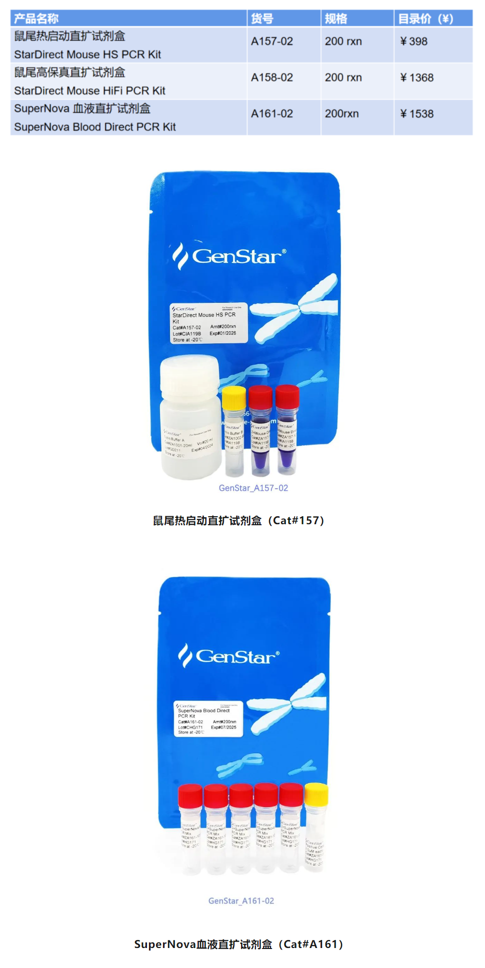 GenStar直擴(kuò)PCR系列為本次展會(huì)咨詢的明星產(chǎn)品,GenStar直擴(kuò)PCR系列產(chǎn)品包括鼠尾直擴(kuò)試劑盒和血液直擴(kuò)試劑盒。無(wú)需核酸提取,直接使用動(dòng)物或植物組織等即可進(jìn)行PCR反應(yīng)。省去了核酸提取環(huán)節(jié),不僅能節(jié)省時(shí)間,又能節(jié)省成本,為核酸擴(kuò)增和檢測(cè)帶來(lái)前所未有的便捷。